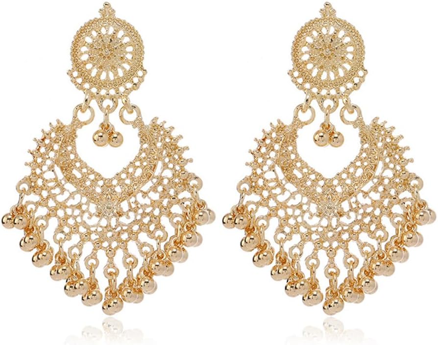 Boho Ball Tassel Statement Dangle Earrings for Women Girls Vintage Flower Heart Shaped Beaded Chandelier Drop Dangling Earring Indian Bollywood Jewelry Gifts for Jhumka Festival Holiday Christmas Light Gold