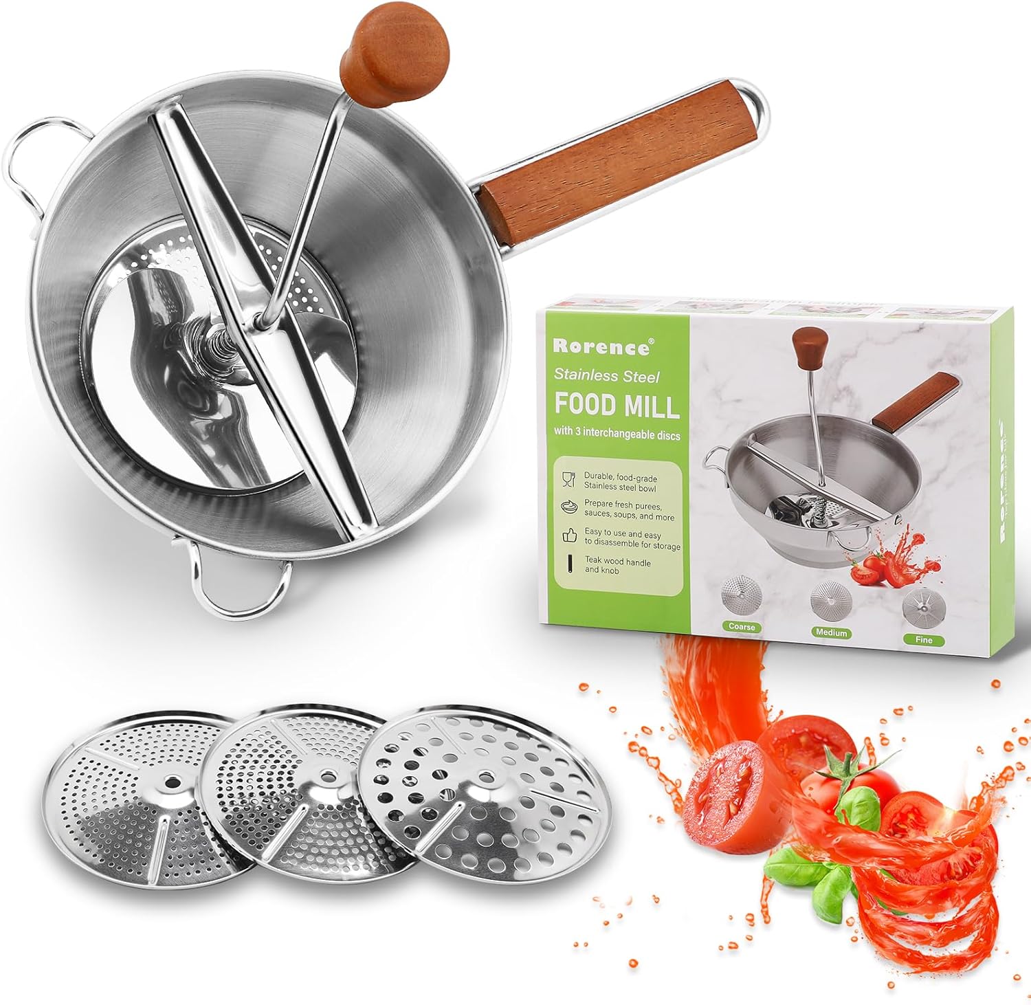 【Versatile Food Grinder】The food grinder is equipped with 3 stainless steel grinding discs, allowing you to create foods with various textures. You can choose between a fine texture (0.12"), medium texture (0.2"), and coarse texture (0.3"). The finely perforated disc is ideal for making jellies and sauces; the medium disc works well for apple sauce and soups; while the largest disc is perfect for chunky sauces and mashed potatoes.