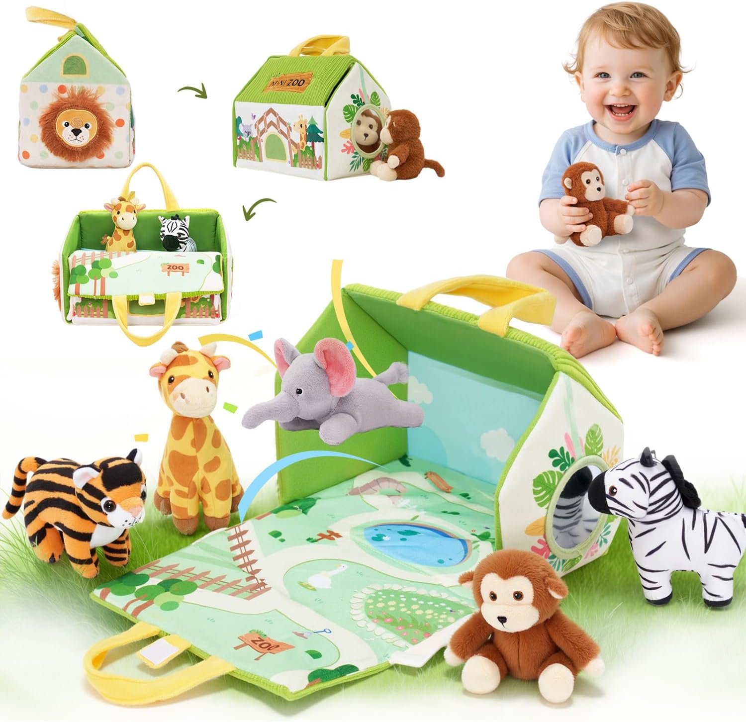 STUFFED ANIMALS ADVENTURE: This soft playset includes a tiger, giraffe, elephant, zebra, and monkey—perfect for helping toddlers explore animals and nature through play.