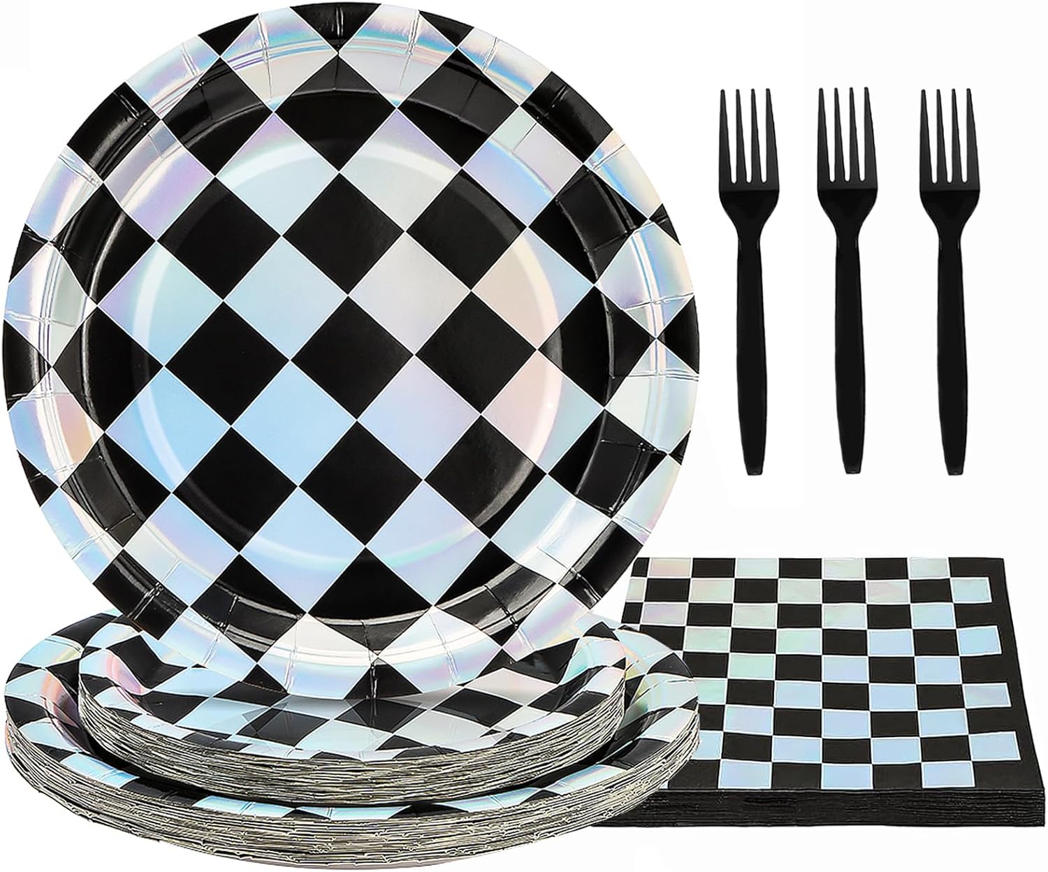 Race Car Black and White Checkered Party Paper Plates and Napkins Sets Include: 24 x 7" dessert plates, 24 x 9" dinner plates, 24 x 6.5" napkins and 24 x 6.1" forks. This quantity is enough to meet your needs for a banquet of 24 guests (Note: Color differences may exist due to different displays.)