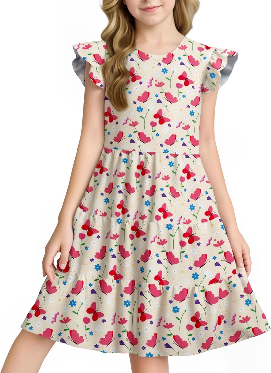 LQSZ Girls Summer Dresses with Ruffle Short Sleeve Midi Casual A-Line Twirly School Sundress Size 3-12 Years Pink Butterfly 9-10 Years image 1 of 5 B0F28VMK4Z