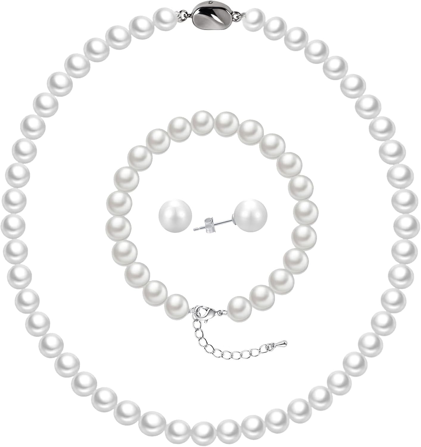 Classic Pearl Set: Crafted from 8mm round white shell pearls, this pearl jewelry set includes an 18-inch necklace, 7-inch bracelet, and 10mm stud earrings. Each pearl is individually hand-knotted for secure fastening, showcasing timeless, refined aesthetics