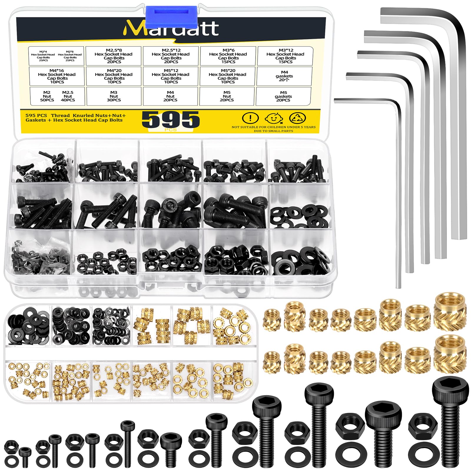 595Pcs M2 M2.5 M3 M4 M5 Brass Threaded Inserts with Hex Socket Head Cap Screws Nuts Kit, Brass Heat Set Insert Metric Knurled Nuts & Machine Screws and Nuts for Plastic 3D Printing Components