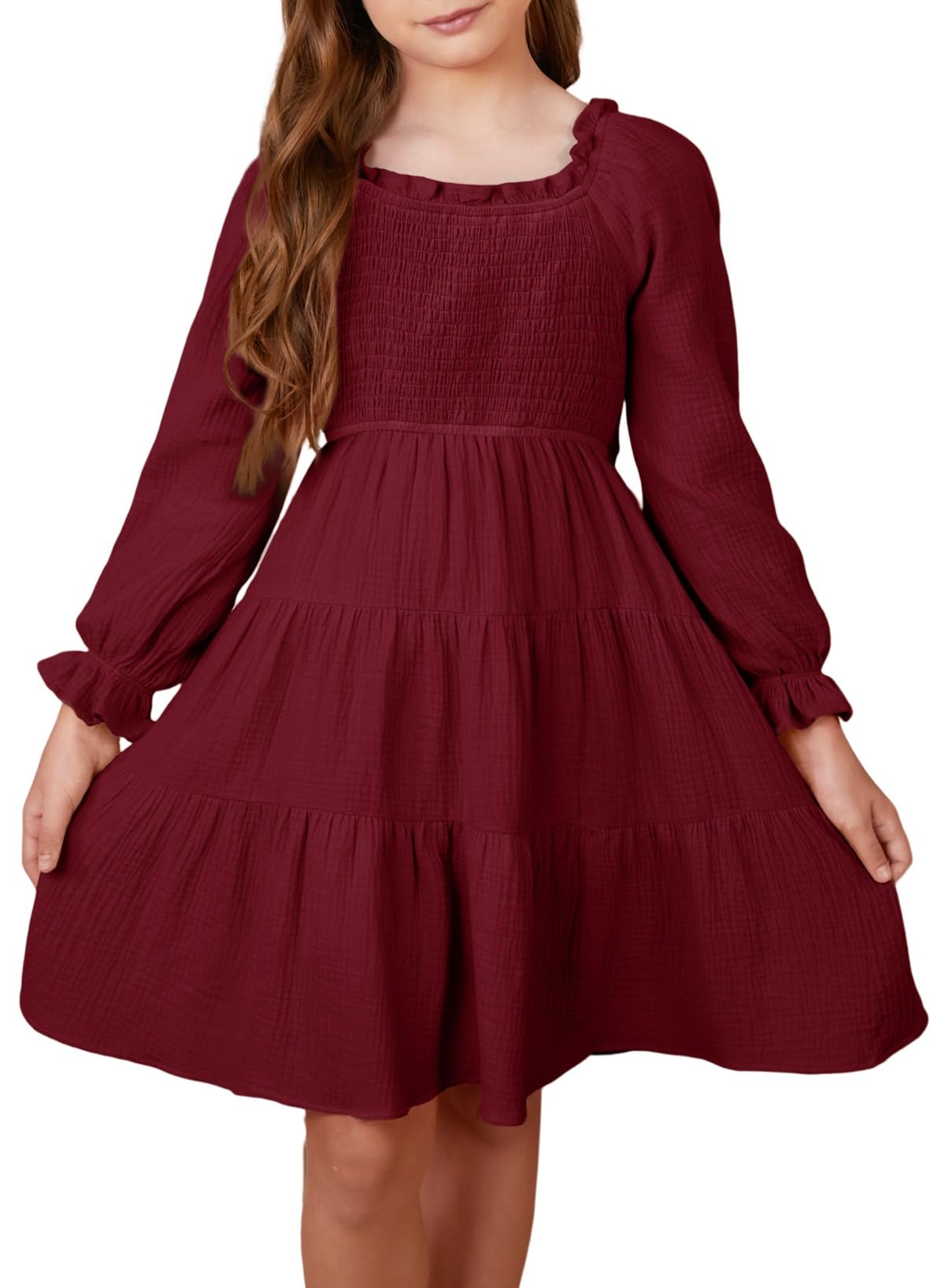GRACE KARIN Girls Fall Long Sleeve Dress for Girl Rullfe Button Casual Flowy Tiered Dresses with Pocket 6-14Years Wine Red 12 Years