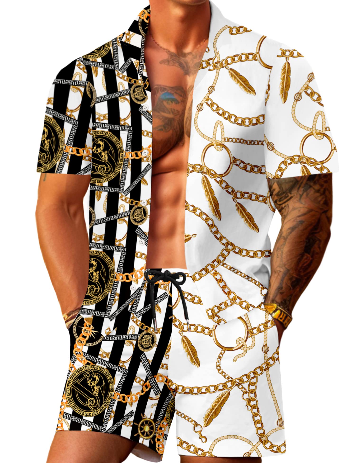 JoZorro Men Hawaiian Shirt Sets Casual Button Down Shirts 2 Piece Luxury Summer Beach Outfits Luxury&chain XX-Large