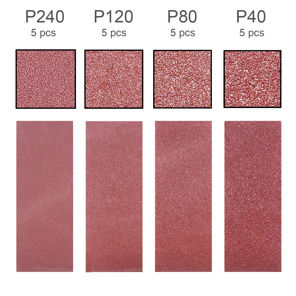 20 PCS Assortment includes 5 each of 40 / 80 / 120 / 240 Grits.
