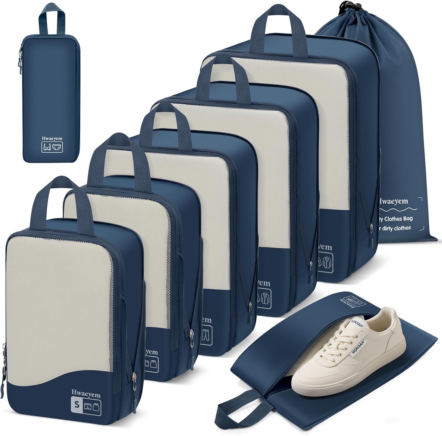 Compression Packing Cubes 8 Set, See-Through Mesh Compression Packing Cubes Travel for Carry on Women/Men, Dual Zipper Packing Bags for Suitcases, Luggage and Backpacks (Navy Blue) 8 Set Navy Blue