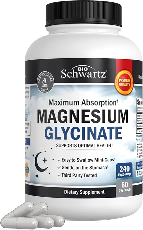 BioSchwartz Magnesium Glycinate 500mg Capsules (240 Mini Caps) Maximum Absorption Magnesium Supplement for Healthy Nerves Muscles Heart Mood and Sleep Support (Vegan, Gluten-Free, Non-GMO)
