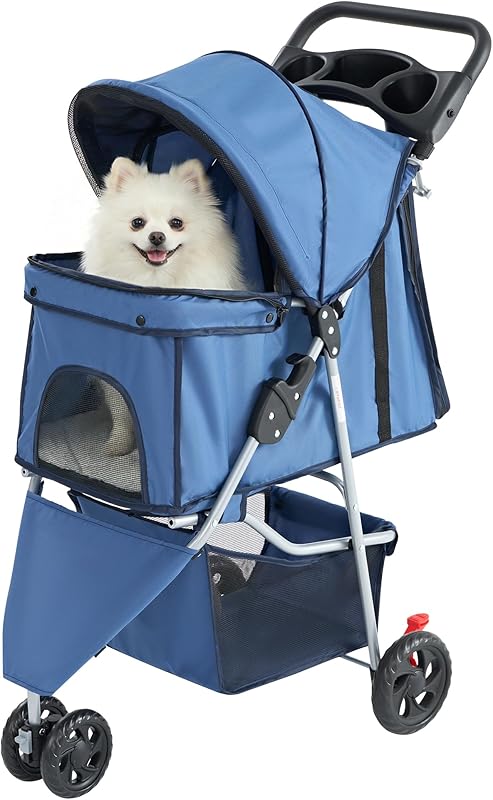 SMUG 3 Wheels Pet Stroller, Dog and Cat Strollers with Storage Basket and Cup Holder, Lightweight Travel Carrier, Breathable, Waterproof and Foldable for Small Pets Outdoor Walk, Blue
