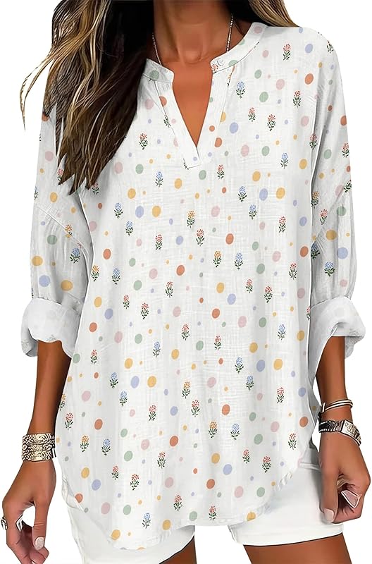 YZCX Womens Spring Tops Button Tunic Linen Blend Floral Printed V-Neck Business Vintage Long Sleeve Boho Summer T Shirts